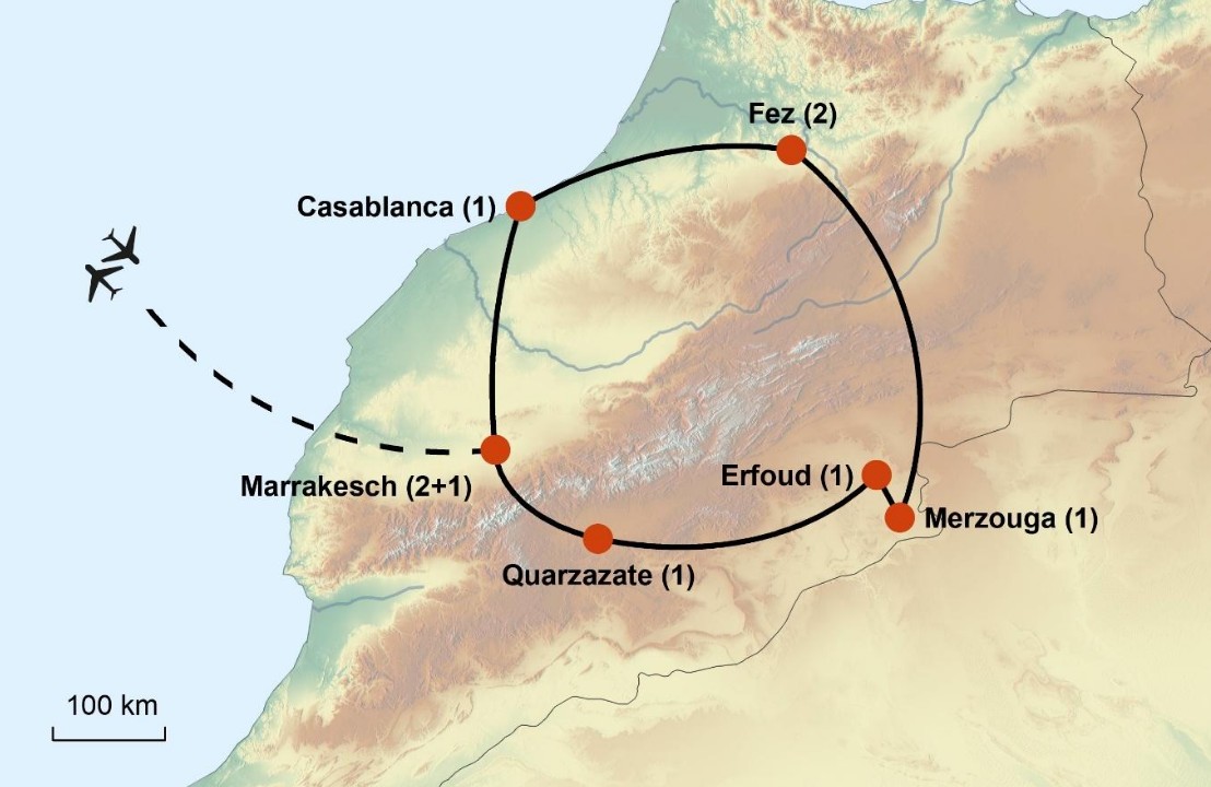 - 9 Übernachtungen in den genannten Hotels der Comfort / Superior Kategorie (oder gleichwertig), davon 1 Wüstenübernachtung und 2 Nächte in einem Riad in Fez